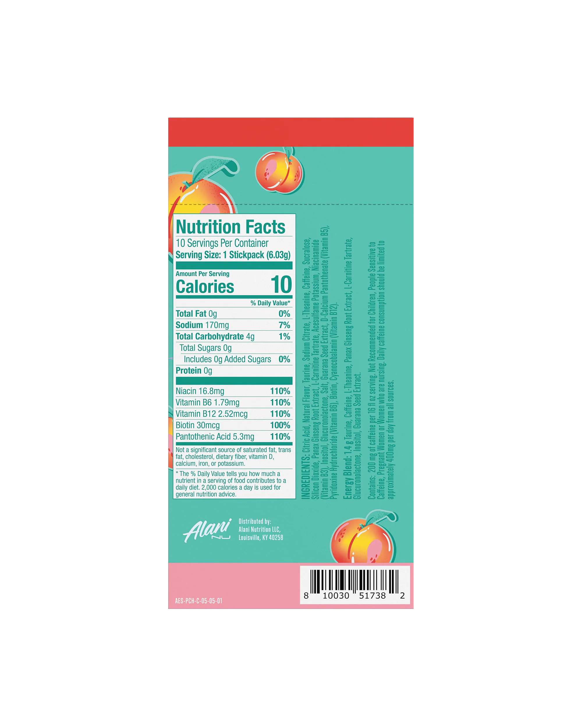 | Ingredients: Citric Acid,Taurine, Maltodextrin, Sucralose, L-Theanine, Caffeine, L- Carnitine Tartrate, Acesulfame Potassium, Gum Arabic, Salt, Natural flavor, Silicon Dioxide, Panax Ginseng Root Extract, Pyridoxine Hydrochloride (B6), Biotin, Cyanocobalamin (Vitamin B12).